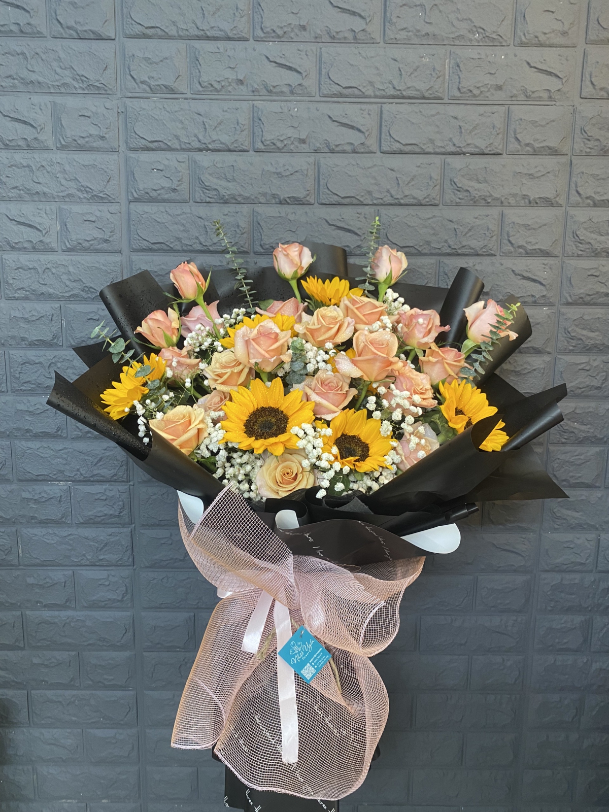 Nguyên liệu Hoa: Hoa Hồng Kem, Hoa Mẫu Đơn, Hoa Hướng Dương, Lan Hồ Điệp trắng, các phụ kiện hoa lá khác