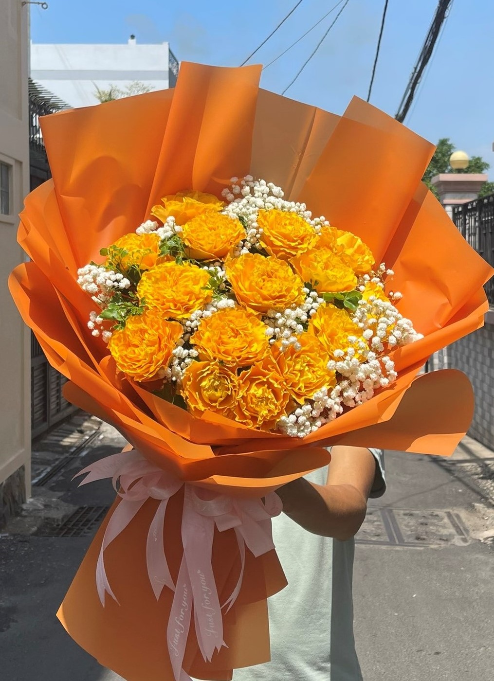 Nguyên liệu Hoa: Hoa Hồng Cam Spirit, Hoa Baby và các phụ kiện hoa lá trang trí khác
