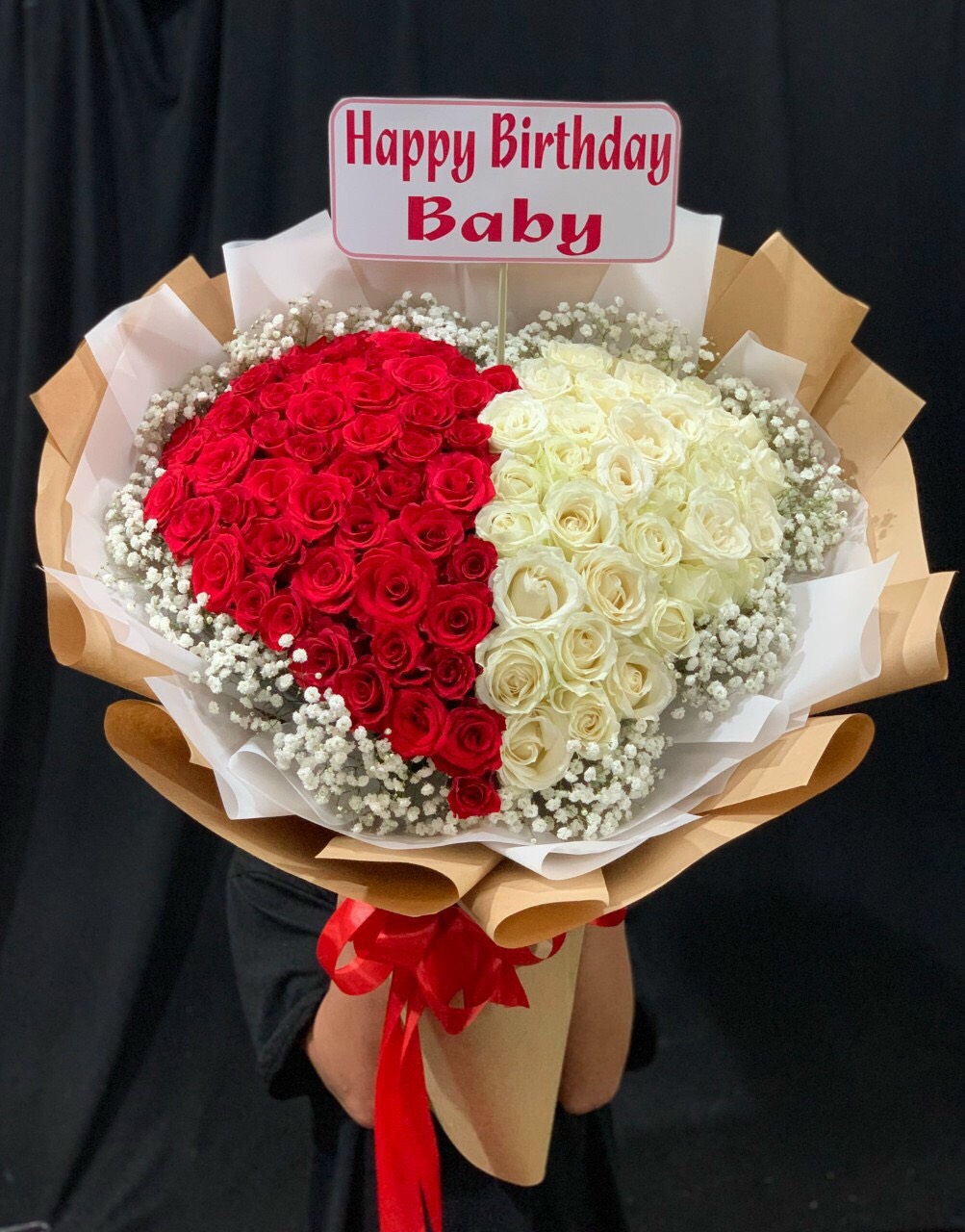 Nguyên liệu Hoa: Hoa Hồng Trắng, Hoa Hồng Đỏ, Hoa Baby và các phụ kiện trang trí khác