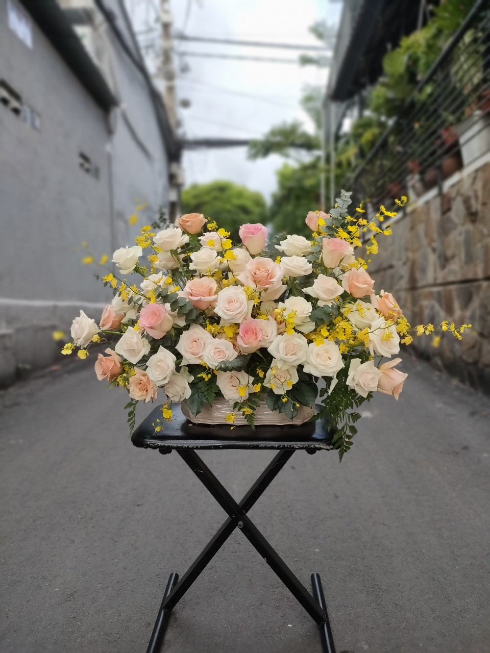 Nguyên liệu Hoa: Hoa Hồng Hồng Phấn, Hoa Hồng Trắng và các phụ kiện hoa lá khác