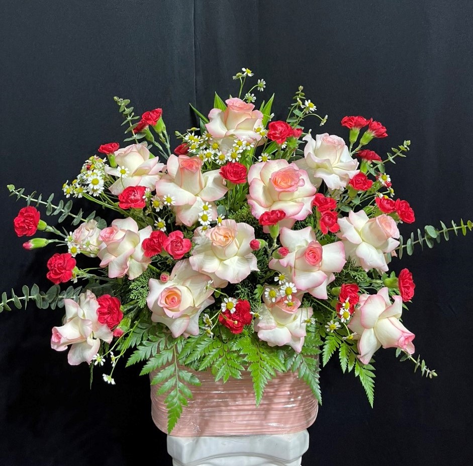 Nguyên liệu Hoa : Hoa Hồng Trắng Cánh Hồng, Hoa Cẩm Chướng và các phụ kiện hoa lá trang trí khác