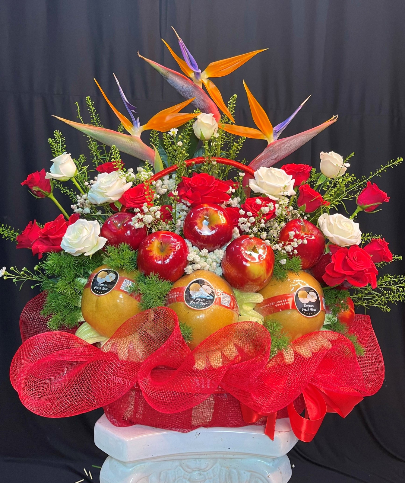 Nguyên liệu Hoa : Táo, Lê, Hoa Hồng Trắng, Hoa Baby và các phụ kiện hoa lá trang trí khác