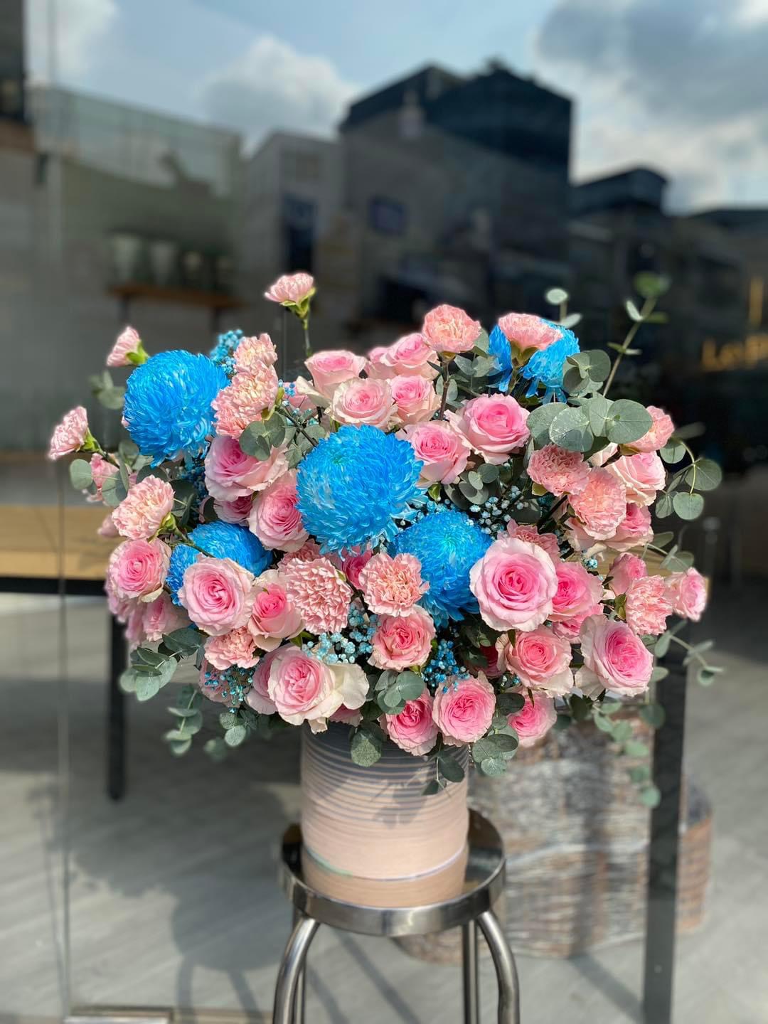 Nguyên liệu Hoa: Hoa Hồng màu Hồng, Cúc Mẫu Đơn Xanh, Hoa Cẩm Chướng Hồng và các phụ kiện trang trí khác