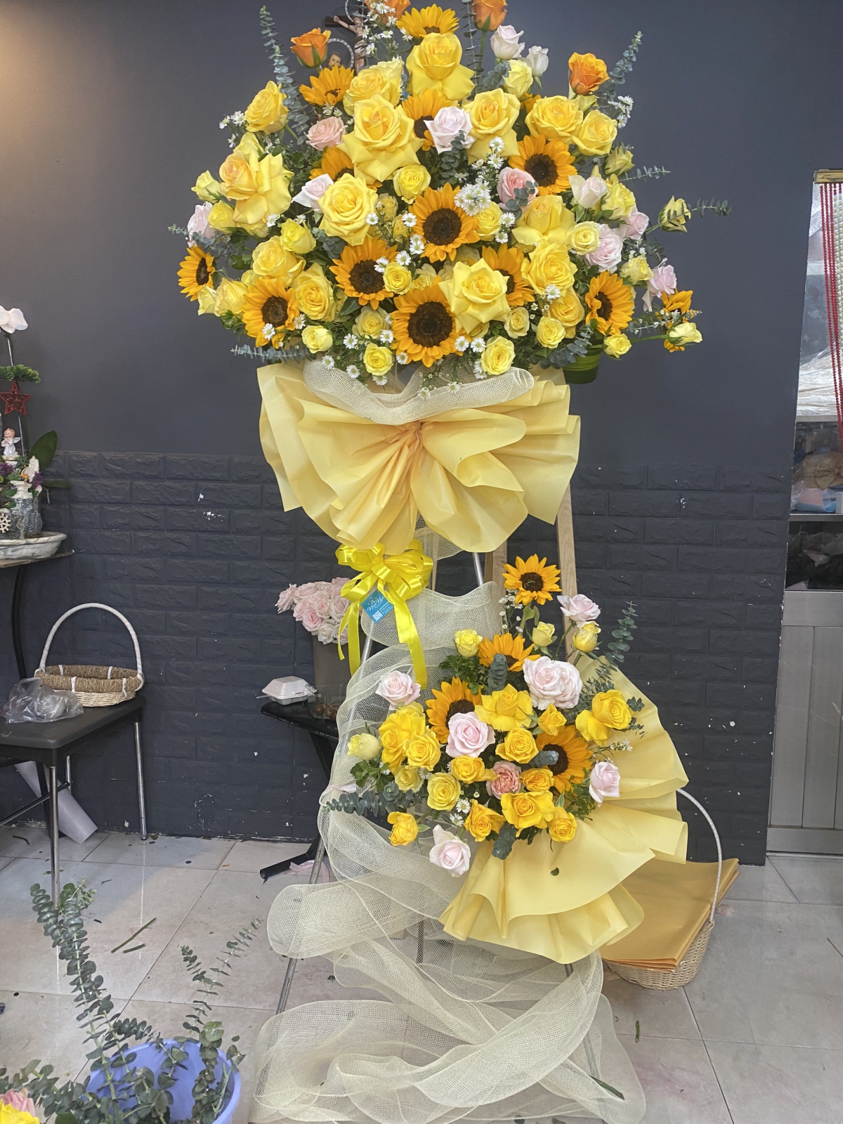 Nguyên liệu Hoa: Hoa Hồng Vàng, Hoa Hồng Phấn, Hoa Hướng Dương và các phụ kiện hoa lá khác